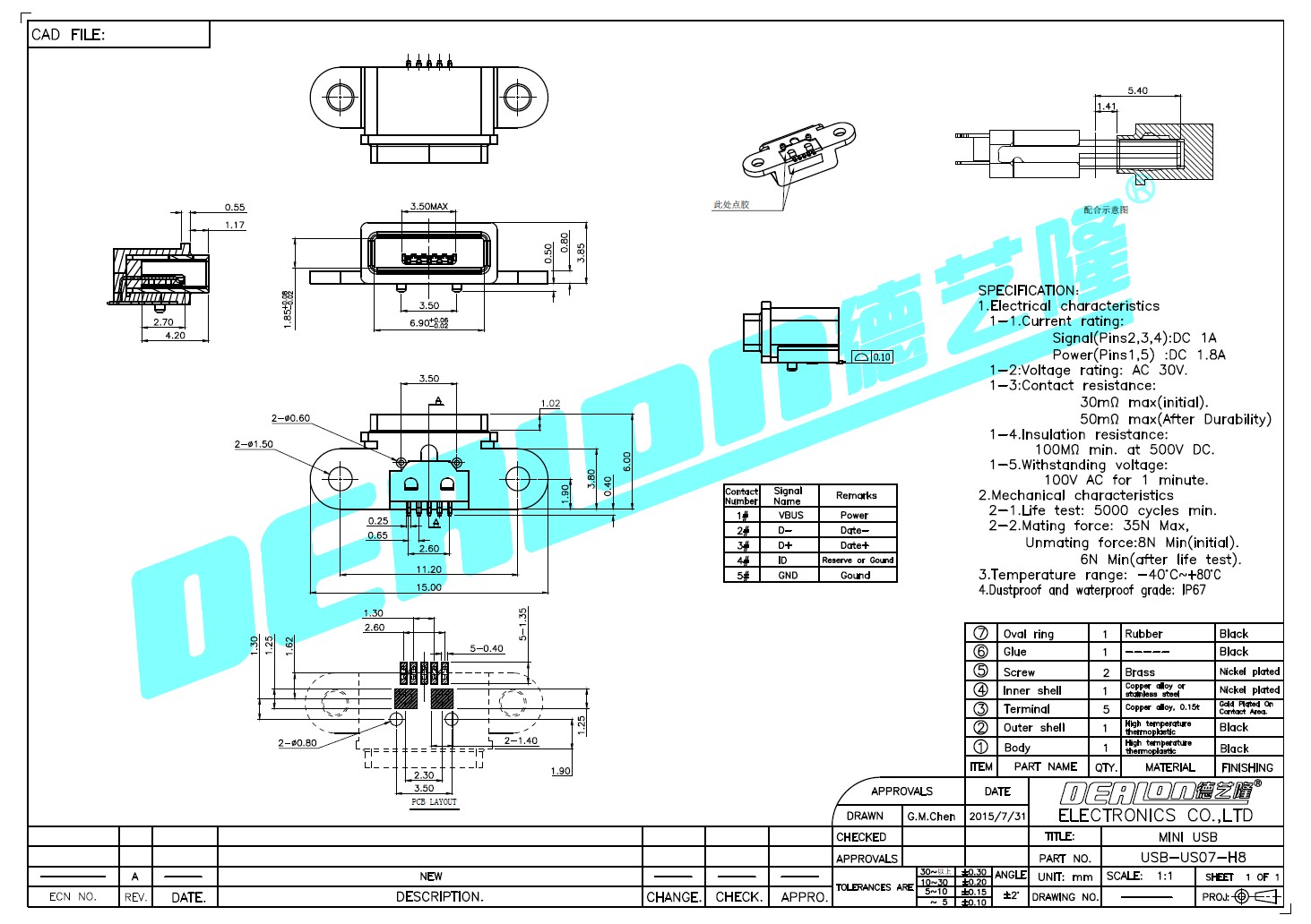 USB插座,型號USB-US07-H8,尺寸:7mm*9mm,由德藝隆精密工業股份有限公司研發生產。自主開發產品包括多功能開關、輕觸開關、檢測開關、滑動開關、帶燈輕觸開關、按鍵開關、微動開關、耳機插座、DC插座等。